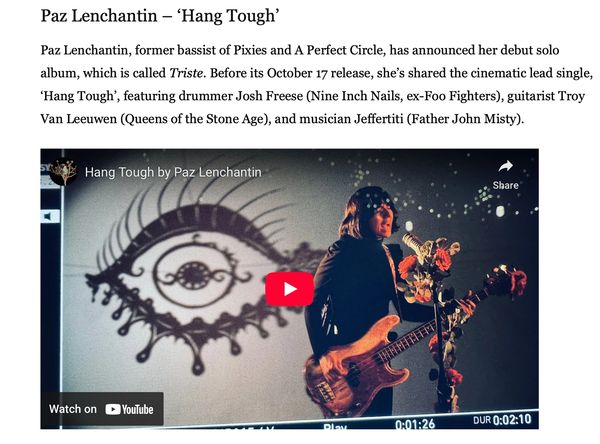 Paz Lenchantin, former bassist of Pixies and A Perfect Circle, has announced her debut solo album, which is called Triste. Before its October 17 release, she’s shared the cinematic lead single, ‘Hang Tough’, featuring drummer Josh Freese (Nine Inch Nails, ex-Foo Fighters), guitarist Troy Van Leeuwen (Queens of the Stone Age), and musician Jeffertiti (Father John Misty).